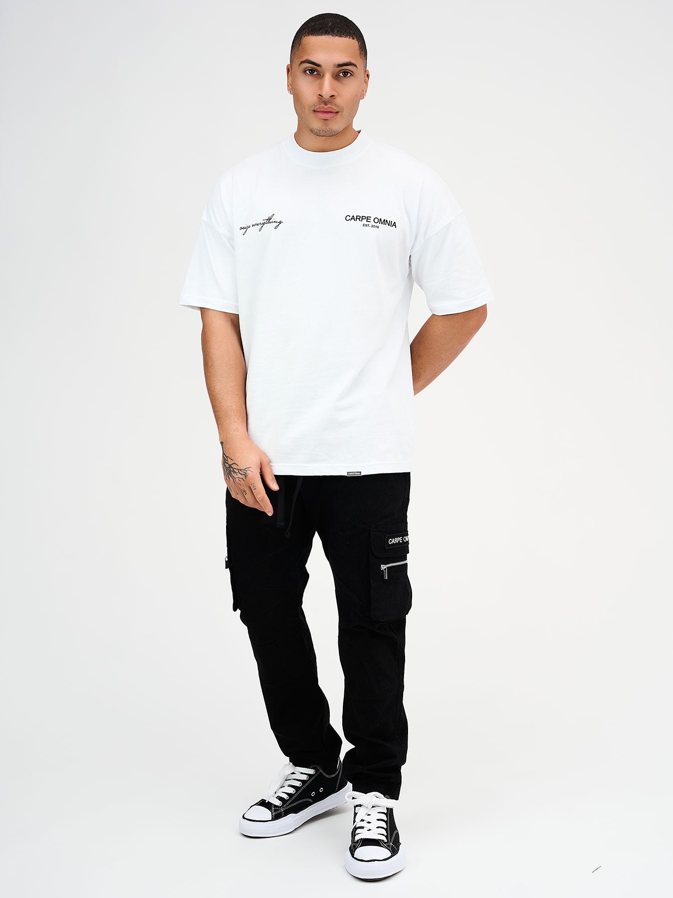 Black Cargo Pants with CARPE OMNIA Pocket.